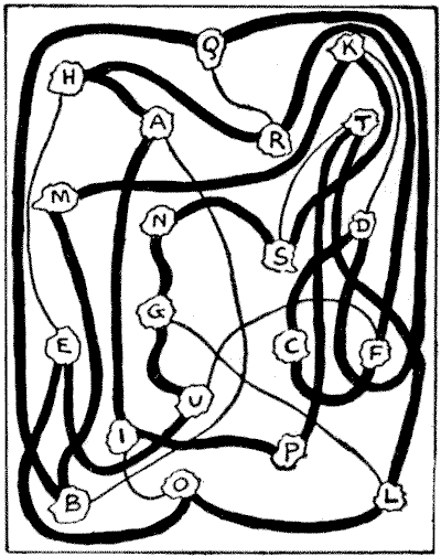 Now, if the sailor takes the first route he will make C his 12th island (counting A as 1); by the second route he will make C his 13th island; by the third route, his 16th island; and by the fourth route, his 17th island. If he goes the reverse way, C will be respectively his 10th, 9th, 6th, and 5th island. As these are the only possible routes, it is evident that if the sailor puts off his visit to C as long as possible, he must take the last route reading from left to right. This route I show by the dark lines in the diagram, and it is the correct answer to the puzzle.